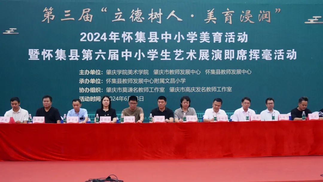 为积极贯彻党的二十大精神,深入落实广东省关于美育浸润行动计划的相关政策,6月13日,由beats365官方网站,肇庆市教师发展中心、怀集县教师发展中心联合主办,怀集县教师发展中心附属文昌小学承办,肇庆市莫谦名教师工作室、肇庆市高庆发名教师工作室协办的第三届“立德树人·美育浸润”2024年怀集县中小学美育活动暨怀集县第六届中小员工艺术展演即席挥毫活动,在怀集县教师发展中心附属文昌小学隆重举行。beats365官方网站副经理邓宇、美术学专业带头人莫世峰、美术学系主任杨帅军;怀集县教师发展中心副书记莫世景;怀集县教师发展中心附属文昌小学党支部书记、董事长莫锦娟,肇庆市名教师工作室主持人莫谦等领导、嘉宾出席活动。
