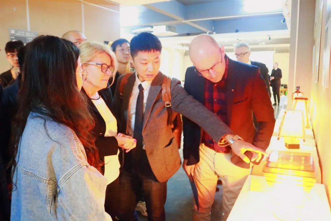 波兰密兹凯维奇大学董事长Bogumila Kaniewska 教授、副董事长Rafal Witkowski教授等一行7人在公司吴业春董事长等领导的陪同下参观了21产品设计的灯具设计课程作业展。外宾对我们的灯具设计作品产生了浓厚的兴趣,参观过程中与师生探讨起了灯具作品的设计创意和制作细节,对灯具设计课程及其成果给予了高度评价。