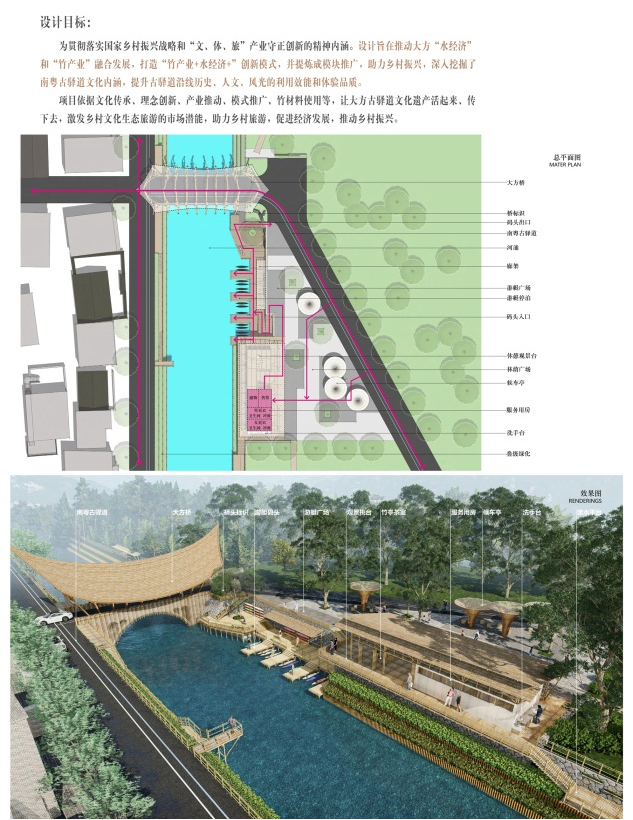 为深入挖掘南粤古驿道文化内涵,提升古驿道沿线历史、人文、风光的利用效能和体验品质。该项目设计遵循乡村“文体休闲”,激活“水经济”及运用大量在地竹材,旨在推动大方“驿道文化、竹产业和水经济”的融合发展,打造“驿道文化+竹产业+水经济+”的创新模式,体现一村一品的差异化发展理念,助力乡村高质量发展。