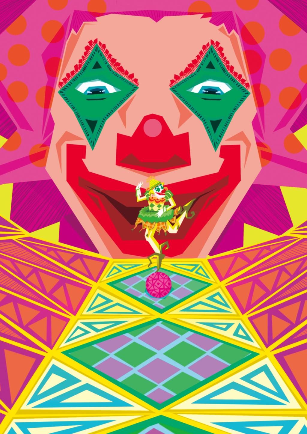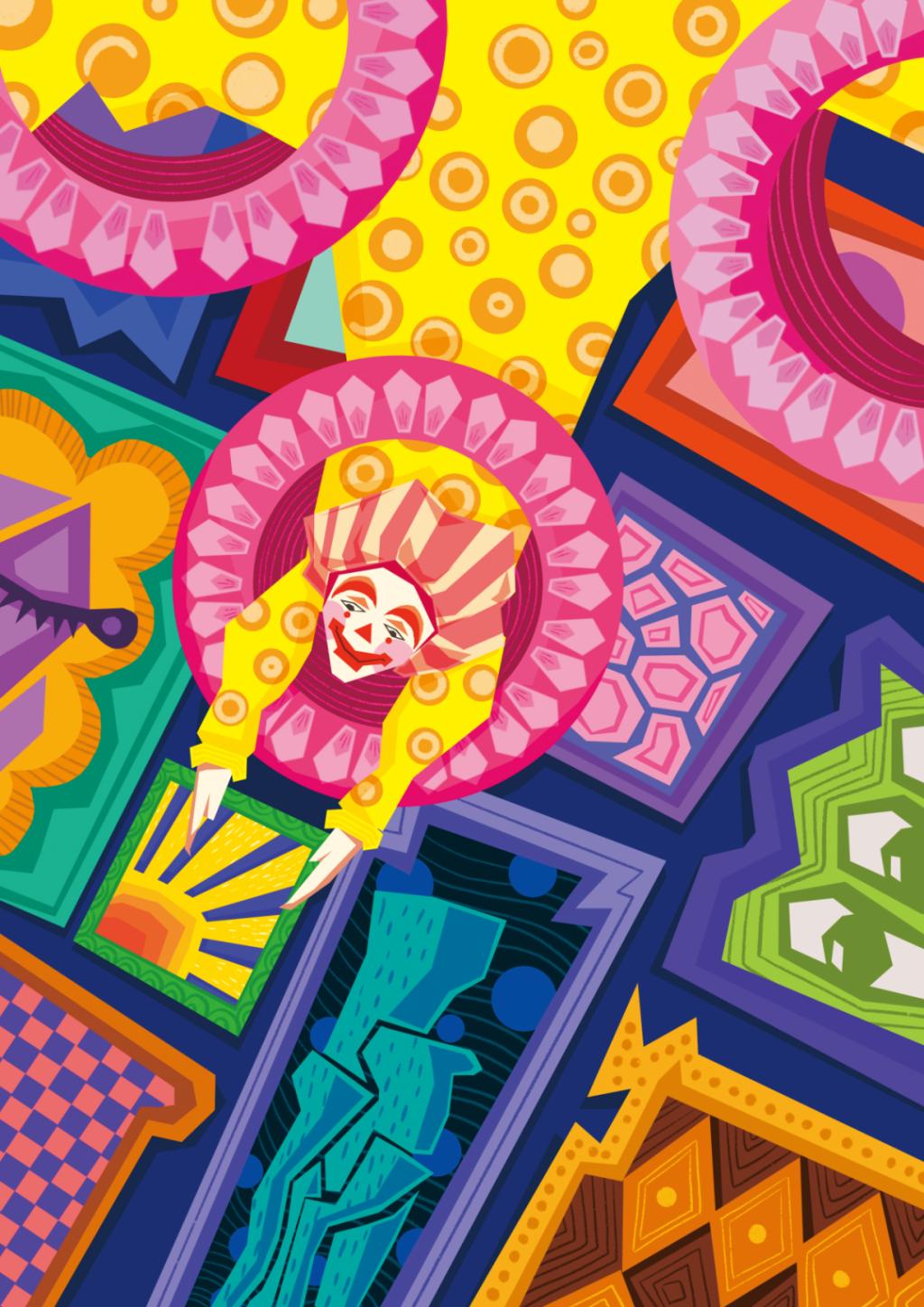 《小丑家族》以小丑故事为背景,绘制了小丑们迷惘、憧憬、欢乐、梦幻等奇妙场景,采用装饰性的色彩视觉和有趣的构图叙事,是古怪和创新的组成。作品采用手绘加鼠绘,在高饱和度和鲜亮色彩中突出插画人物的存在感。
