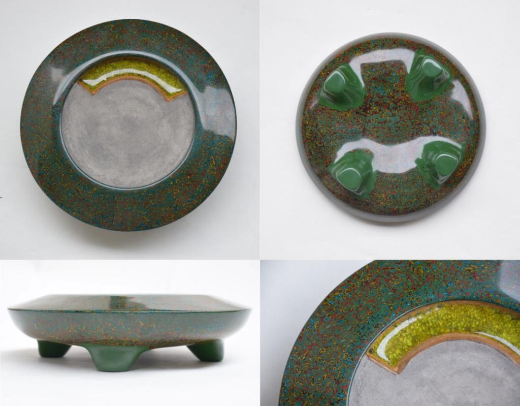 作品主题构思是制作综合性材料砚台,简称漆陶砚,即以陶瓷材料制作砚台坯体,漆艺绘制砚台坯体装饰的漆器砚台。造型设计是以方圆结合的原理,在正面,设计出砚堂和砚池的位置,在背面,设计合适的砚足造型,整体造型以圆润的方式过度。造型装饰是以漆器中的犀皮漆进行表面装饰,即以绿色漆作为砚台的主色,分别以黄、红、蓝色漆为辅色,颜色漆之间相互交集。