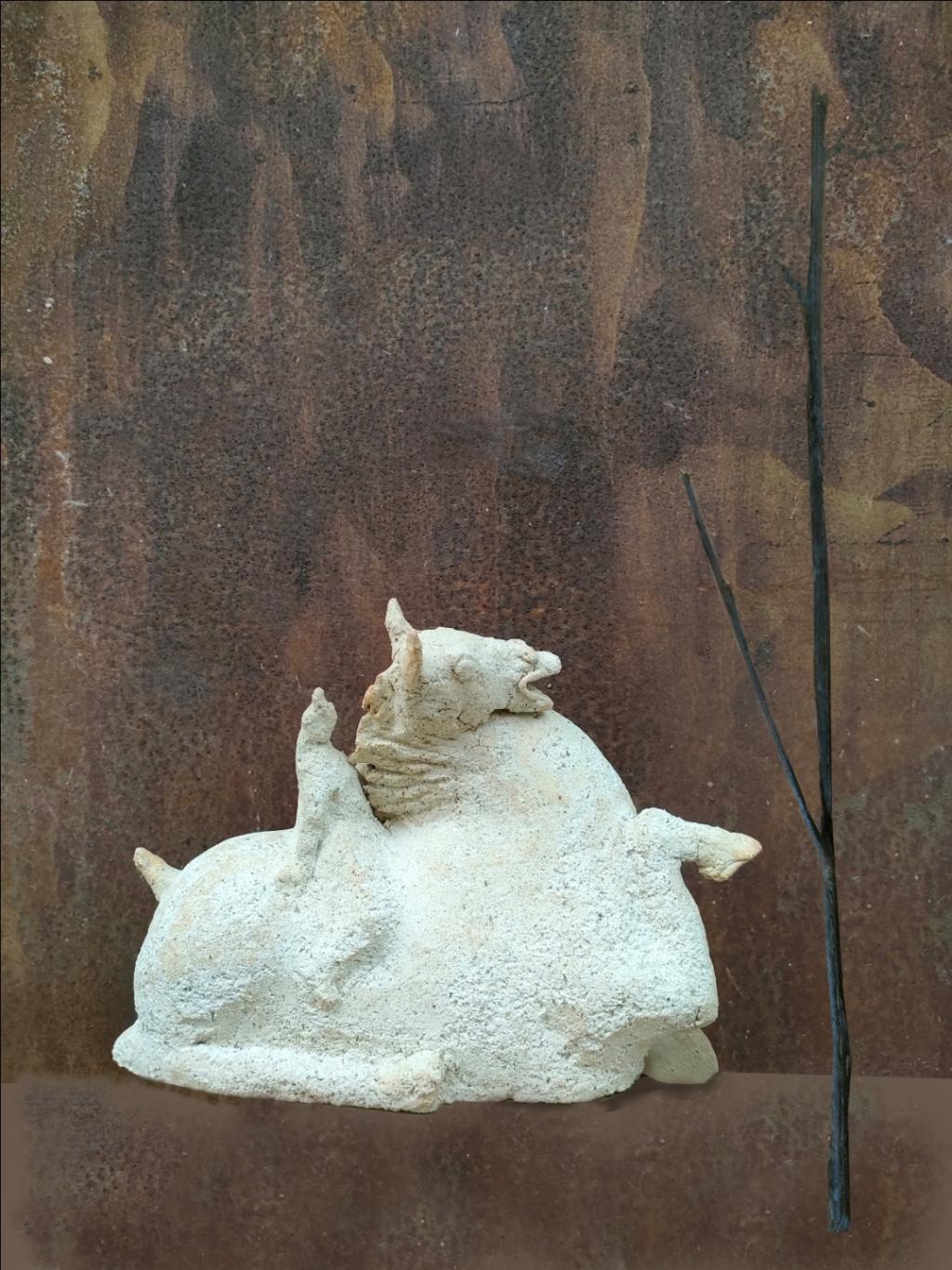 中国传统雕塑有几千年的历史,其造型特征重在传神、主观、形而上、本真写意。秦汉雕塑的精神气质和造型风格对后世美术发展有着深远的意义。本作品从造型特征上继承了中国传统雕塑的造型风格,并以粗陶为媒介材料烧制而成。