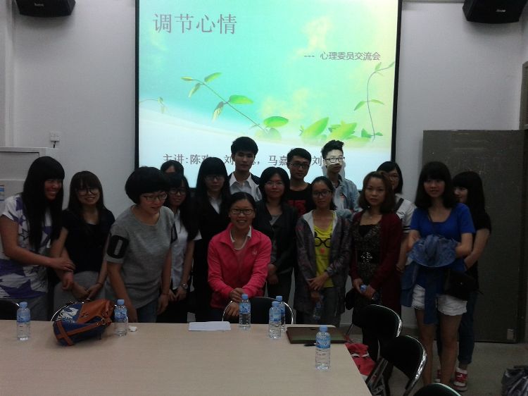 (本网讯)为了更好的普及心理健康基本知识,提高心理委员的心理健康水平,培养心理委员察觉和处理心理问题的能力,beats365官方网站特邀公司心理辅导中心于2014年4月27日18:00-19:15在美术楼316室展开了以“如何调节心情?”为主题的交流会。出席本次交流会的有校心理中心张丽玲老师、朋辈咨询员陈欢、刘奕偲、马嘉欣、刘旭辉以及beats365官方网站心理辅导站站长王素净老师和beats365官方网站各班心理委员。