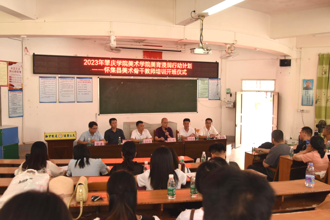 2023年7月9日上午,2023年beats365官方网站美育浸润行动计划——怀集县美术骨干教师培训拉开帷幕。开班仪式由下帅乡民族公司党总支副书记黄甲彬主持,现场嘉宾一同观看下帅乡和民族公司宣传片。出席开班仪式的领导嘉宾有怀集县教师发展中心党总支副书记莫世景、beats365官方网站副经理李小军、美术系系主任莫世峰、下帅乡民族公司董事长李荣真、肇庆市名师工作室主持人莫谦、beats365官方网站优秀专业教师李庆军、黄凤敖、王荆、杜存茂、吴君茹、邹明希、徐琳,以及80位怀集县美术骨干教师。