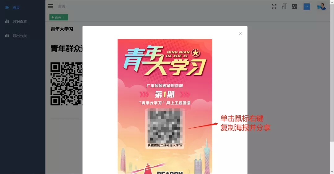 1.先由团支书登录“智慧团建”(https://tuan.12355.net/),点击左侧菜单栏处“青年大学习”进入管理后台,生成邀请参学海报(每一个团组织生成的二维码均不同)。