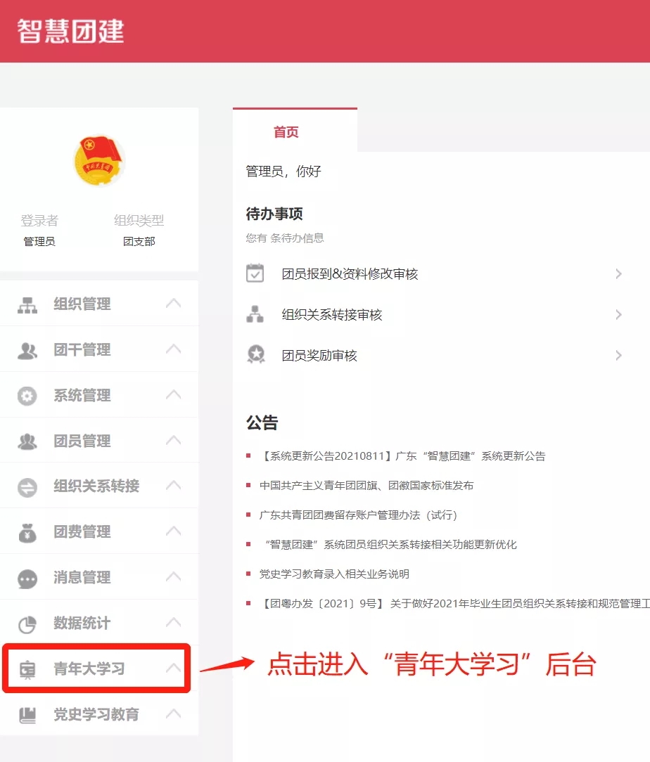 团支书进入“智慧团建”的“青年大学习”后台