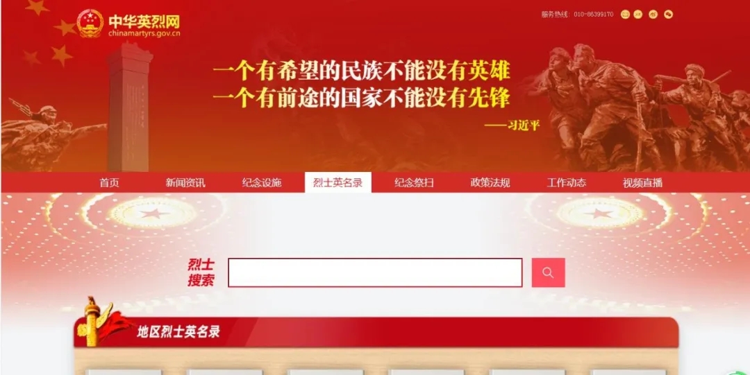 3.在中华英烈网首页点击“英烈英名录”专栏,根据地名查找烈士,进行网上祭扫。