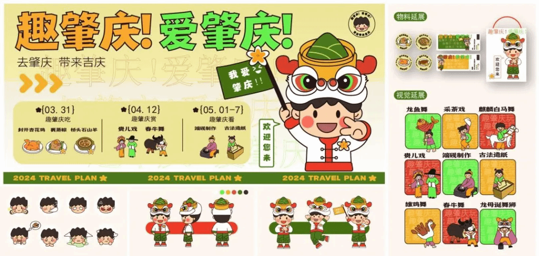 肇庆是广府文化的发源地,很多庙会活动都会举行舞狮助兴、吃粽子等民俗活动。文旅IP形象设计庆仔以此为设计灵感,融入了舞狮与裹蒸粽元素整体搭配丰富的色彩进行设计,延展出一系列肇庆非遗文化,具有较强的识别度与独特的文化意义。
