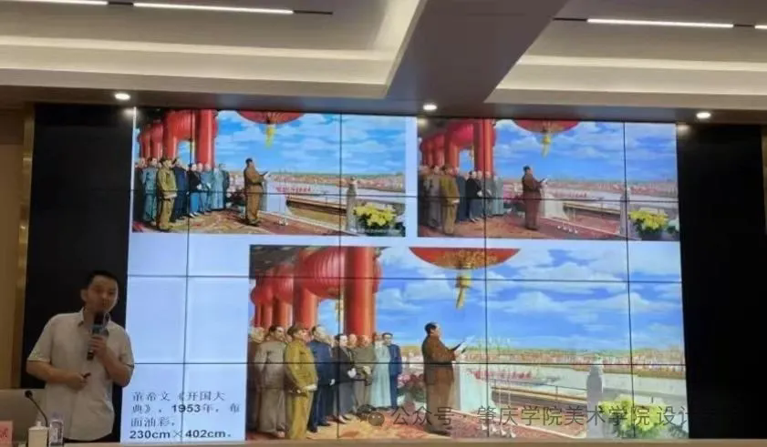 讲座中,胡斌教授以董希文、胡一川这两位红色革命美术家的个案研究为例,深入浅出地分析了两位美术家的艺术追求、创作理念以及主要作品,系统探讨了美术作品如何真实而生动地反映出特定的时代背景和文化变迁。通过对董希文《开国大典》不同时期版本的解读,胡教授强调了美术研究的多元性和复杂性。通过对历史细节的深入挖掘和细致分析,才能更准确地把握艺术发展脉络,理解美术家创作背后的深层意图。在互动环节中,公司师生围绕主题性创作等方面问题向胡斌教授进行了请教,胡教授针对问题进行了耐心答疑。