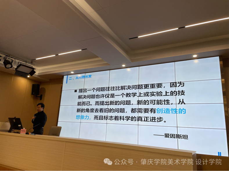 卢世主教授是设计学领域的资深学者,深耕设计研究与学术写作多年,拥有丰富的研究与指导经验。讲座伊始,他以爱因斯坦“提出问题往往比解决问题更重要”的经典论述破题,将“从问题出发”确立为设计研究的核心逻辑。他指出,解决问题或许是技术层面的能力,而提出新问题、从新视角审视旧问题,更需要创造性的想象力,这也是设计学科实现学术突破的关键所在。