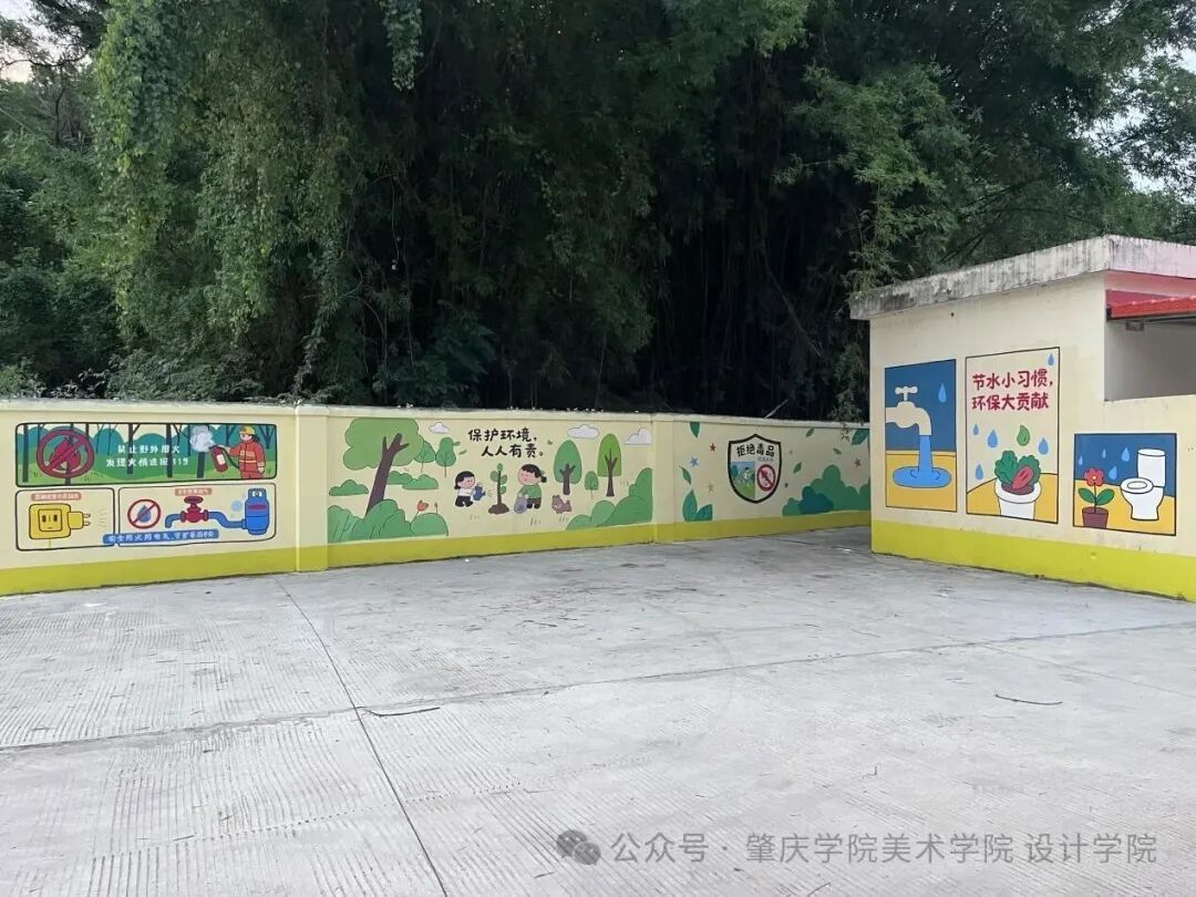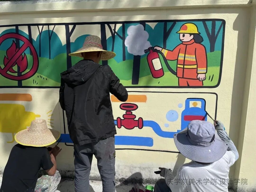 从前期施工到成果落地,实践团用专业与坚持攻克诸多难题:队员们顶着30℃+高温调和颜料,趴在围墙边逐寸勾勒线条,为匹配小员工审美反复调整图案比例,甚至专门测试3种颜料配方以确保墙绘耐晒耐雨——每一幅作品的背后,都是对“三所公司”项目“赋能县域教育”目标的践行。
