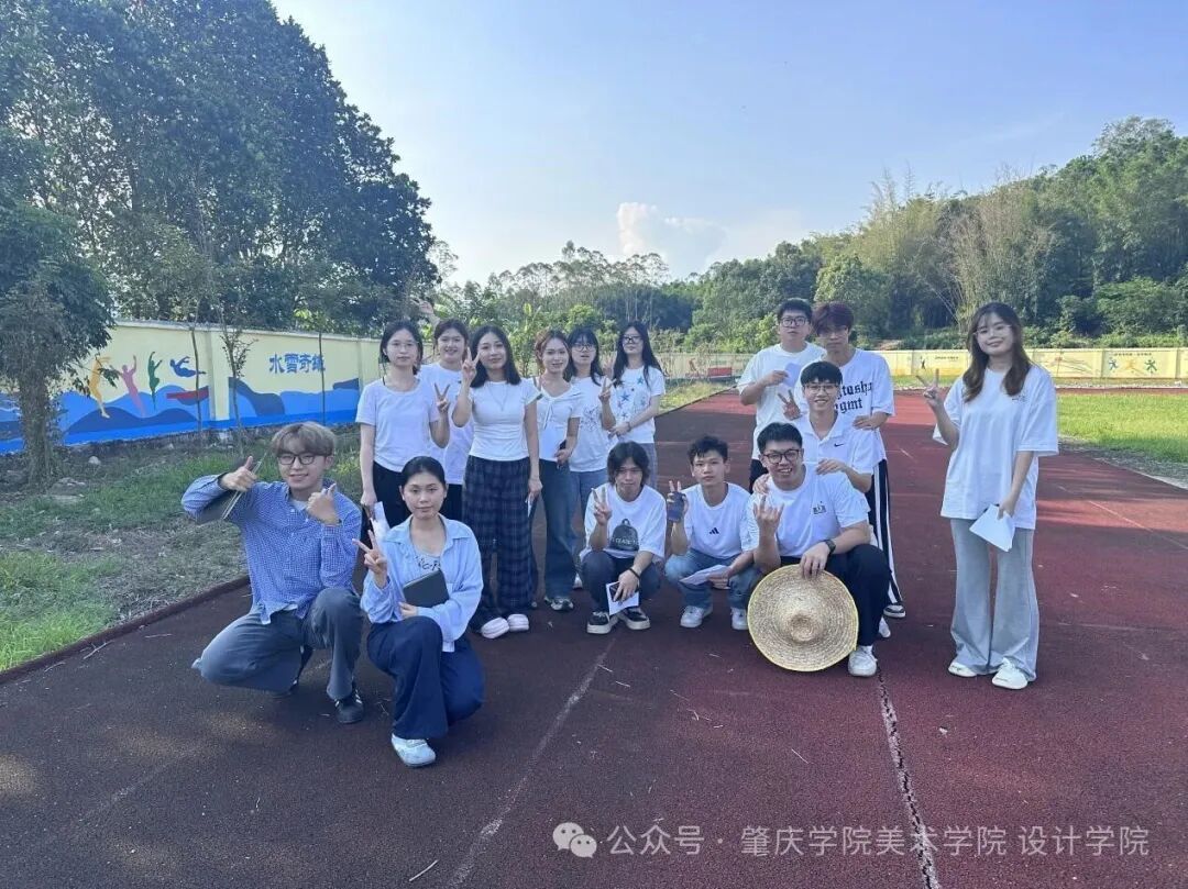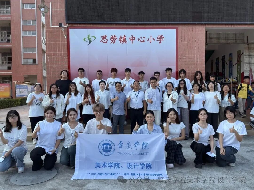 实践团成员与自己创作的墙绘合影时,成就感溢于言表——有的队员指着“传统薪火”墙绘说“这是我画的太极图案”,有的兴奋地回忆“画田径墙绘时,小学老师还来给我们讲员工的运动故事”。 交流尾声,实践团与思劳镇中心小学师生代表在墙绘前合影,员工们围绕墙绘兴奋讨论,笑容灿烂。 此次实践是公司响应“百千万工程”、深化“三所公司”项目帮扶的行动,也为县域小学文化建设提供了样本。后续,实践团将持续关注校园需求,用设计助力思劳镇中心小学打造更多特色育人场景,推动县域教育提质。
