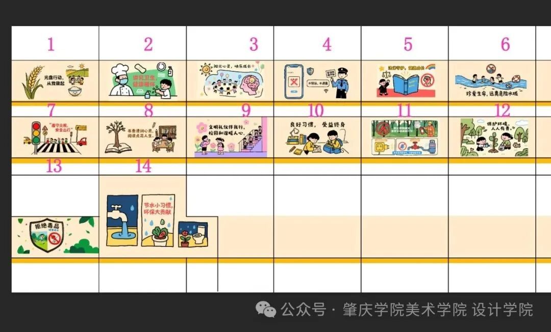 食堂至卫生间区域的13幅围墙墙绘,聚焦员工日常素养培育,覆盖多类实用主题:“光盘行动,从我做起”以金黄麦穗与整洁餐桌为背景,倡导节约粮食;“讲究卫生,健康相伴”展现洗手、消毒的场景,传递卫生习惯;“阳光心灵,快乐成长”用笑脸与绿植图案,守护员工心理健康;“不轻信,不透露”的防诈主题里,民警形象搭配警示语,强化安全意识;“珍爱生命,远离危险水域”以蓝色水波与警示标志,敲响防溺水警钟;还有“遵守交规,安全出行”“书香浸润心灵”“文明礼仪伴我行”等主题,将文明理念融入每一笔色彩。