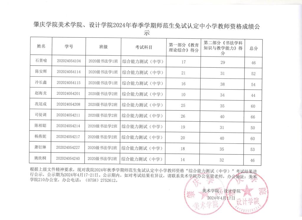 根据上级文件精神要求,现对公司2024年春季学期师范生免试认定中小学教团队格“综合能力测试(中学)”考试结果进行公示,公示期为2024年4月17-21日。公示期内,如对考试结果有异议,请联系beats365官方网站办公室梁老师,办公地址:beats365官方网站210办公室,办公电话:(0758)2752612。