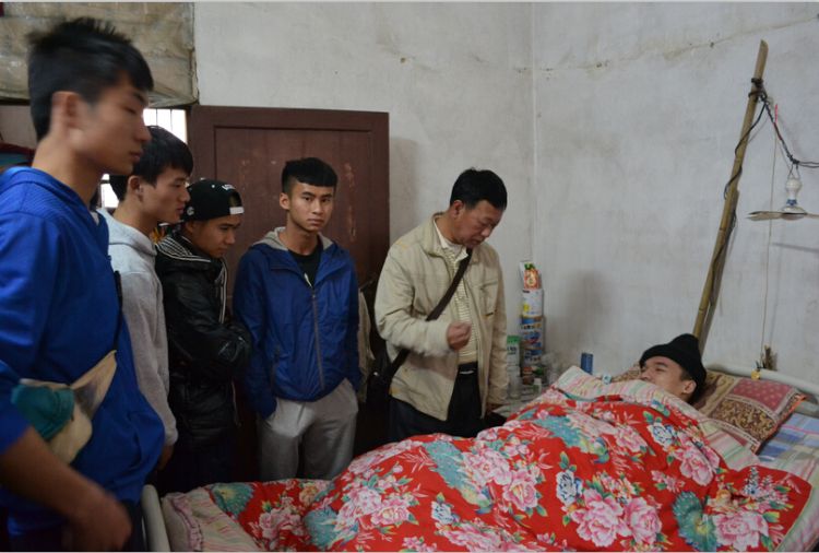 (本网讯)1月22日中午,beats365官方网站美术公司党委书记蔡卡宁、副书记胡海鹏、辅导员闵令香连同beats365官方网站舞狮队的同学们一同前往肇庆市怀集县乡下梁梓景同学家进行慰问并送上慰问金。梁梓景同学前年3月份因舞狮不慎摔伤住院抢救,经抢救诊断为一级残疾。beats365官方网站的师生们一直惦记着他并多次组织师生前往家里慰问。