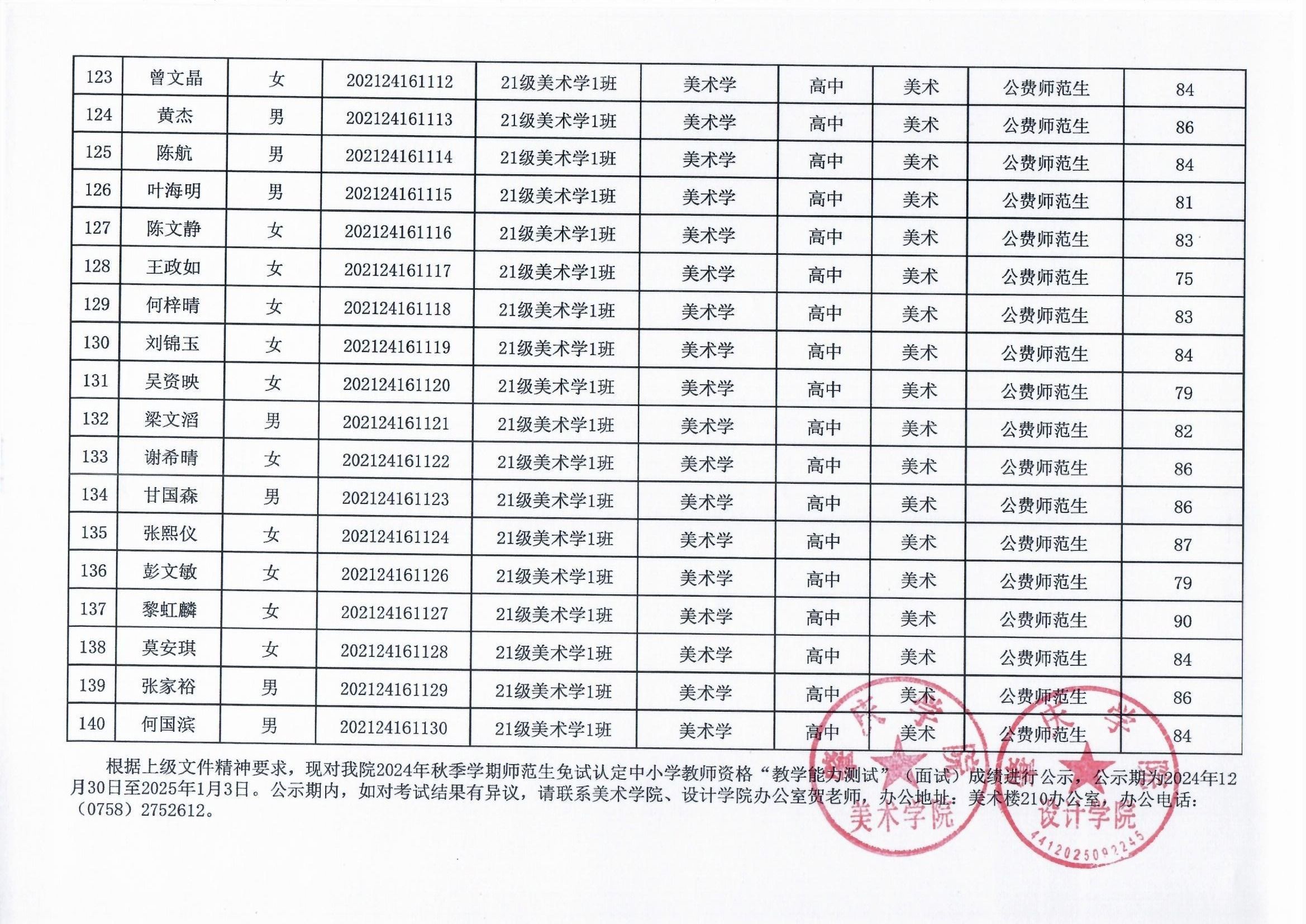 根据上级文件精神要求,现对公司2024年秋季学期师范生免试认定中小学教团队格“教学能力测试”(面试)结果进行公示,公示期为2024年12月30日至2025年1月3日。公示期内,如对考试结果有异议,请联系beats365官方网站、设计公司办公室贺老师,办公地址:美术楼210办公室,办公电话:(0758)2752612。